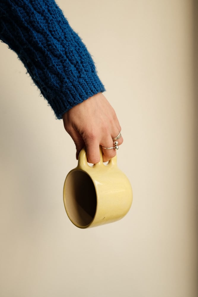 Soft yellow glossy mug with subtles dark speckles. Each mug is thrown and has an handbuilt handle using a double coil technique as in the Grid pattern. The double handle is perfect for warmly holding your hot chocolate, tea or coffee.
